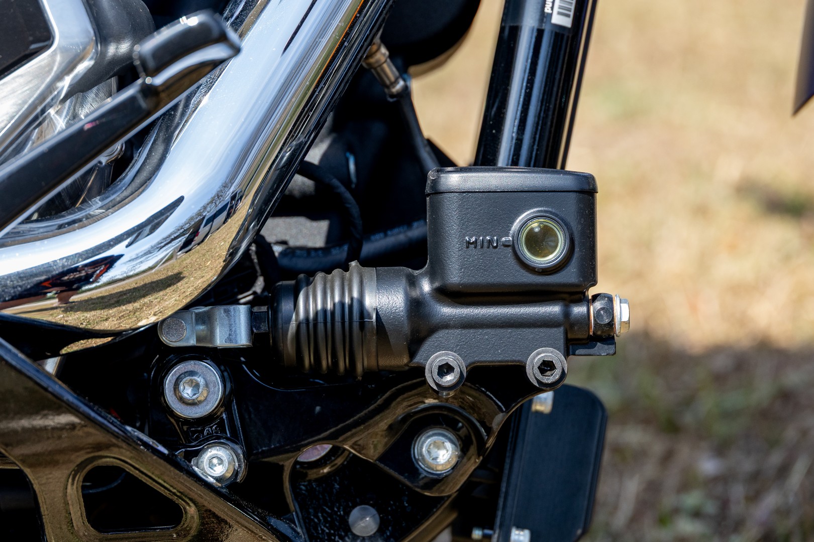 ส่วนเบรกหลัง Street Bob คันนี้ พักเท้าเป็นแบบ Mid-controls กระปุกน้ำมันเบรกอยู่ด้านหน้าปลายเท้า และขาพักเบรกยกสูง ทำให้ต้องใช้น้ำหนักกดเยอะหน่อย แต่ถ้าเผลอออกแรงมากไปก็ไม่ต้องกังวลว่าล้อจะล็อค เพราะเขามี ABS ทั้งหน้า-หลัง แถมมี C-ABS ที่ทำงานในโค้งโดยวัดจากองศาการเอียงของรถด้วย เอาอยู่สบาย ๆ