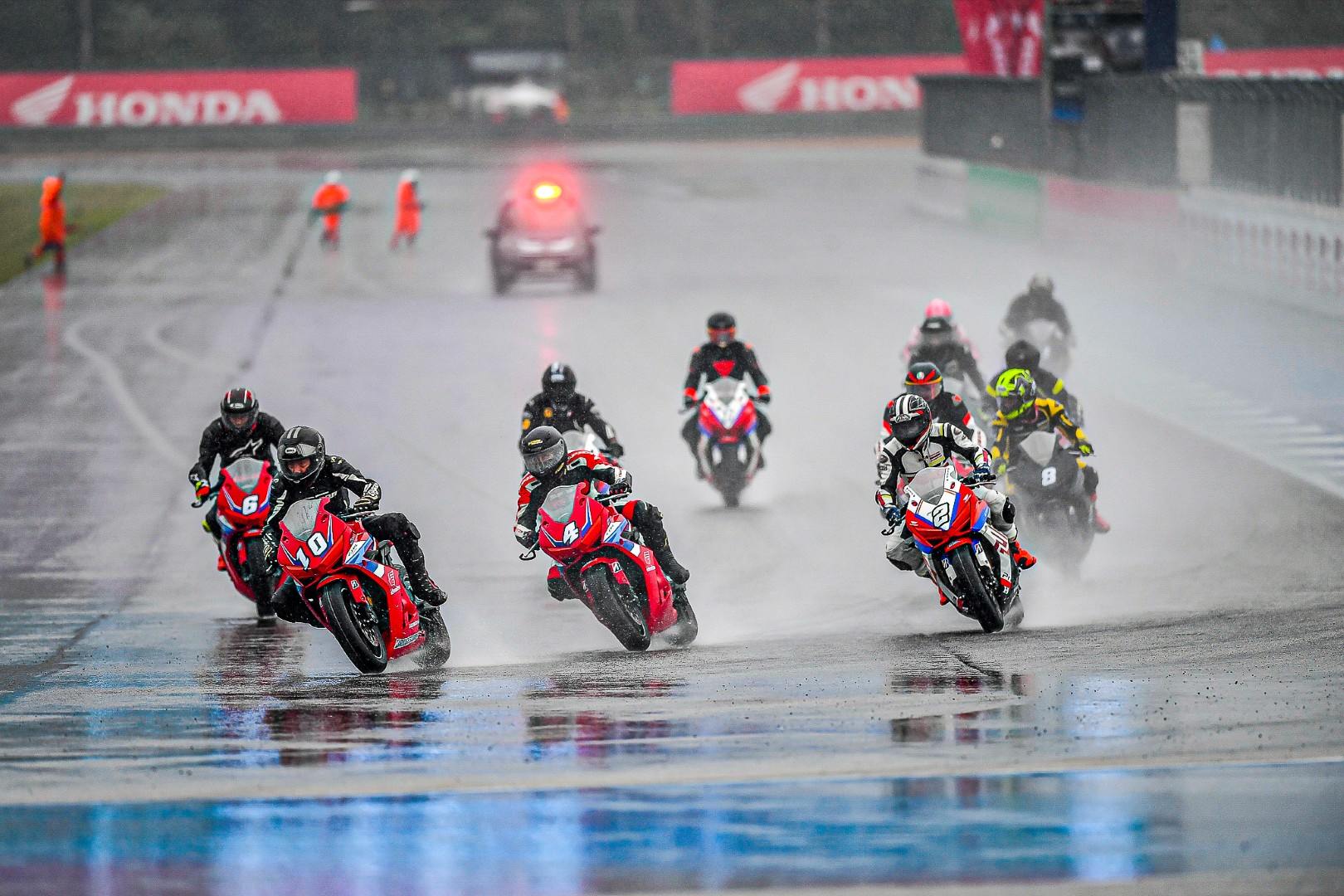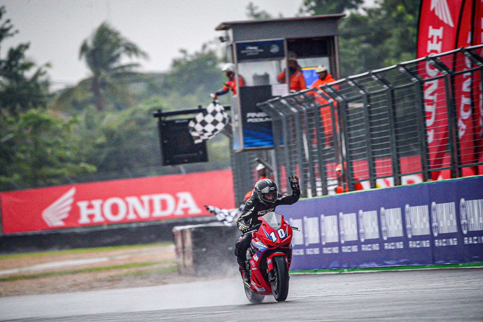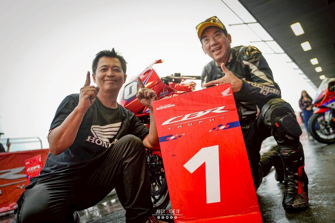 เป็นไปตามคาด CBR650R E-Clutch ของผมขึ้นนำไปคว้าโฮลช็อต พร้อมยืนระยะทะยานผ่าน Wet Race ในครั้งนั้นไปได้แบบไม่กดดัน แม้ชุดแข่งจะเปียกจนชุม ชิลด์หมวกจะเต็มไปด้วยหยดน้ำ แต่ก็ยังสามารถคว้าอันดับ 1 มาครองได้ด้วยเวลา 2.09 อ่อน ๆ พร้อมความเร็วเฉลี่ยที่ทำได้ 203.80 กม./ชม. ท่ามกลางสายฝน จบการแข่งด้วยความสนุก ปลอดภัย บน CBR650R E-Clutch ที่ช่วยให้คุมคันเร่งได้นุ่ม ๆ ในทุกเกียร์ที่เลือกใช้ โฟกัสได้เต็มที่กับไลน์การขี่ และยาง Racing Battlax W01 ที่รีดน้ำดีมาก เกาะกริป ไม่มีเหวอเลยสักครั้ง