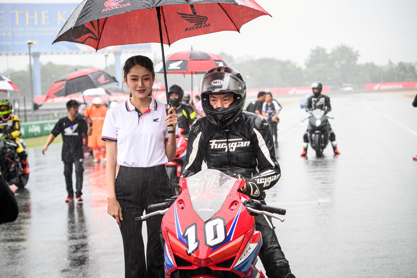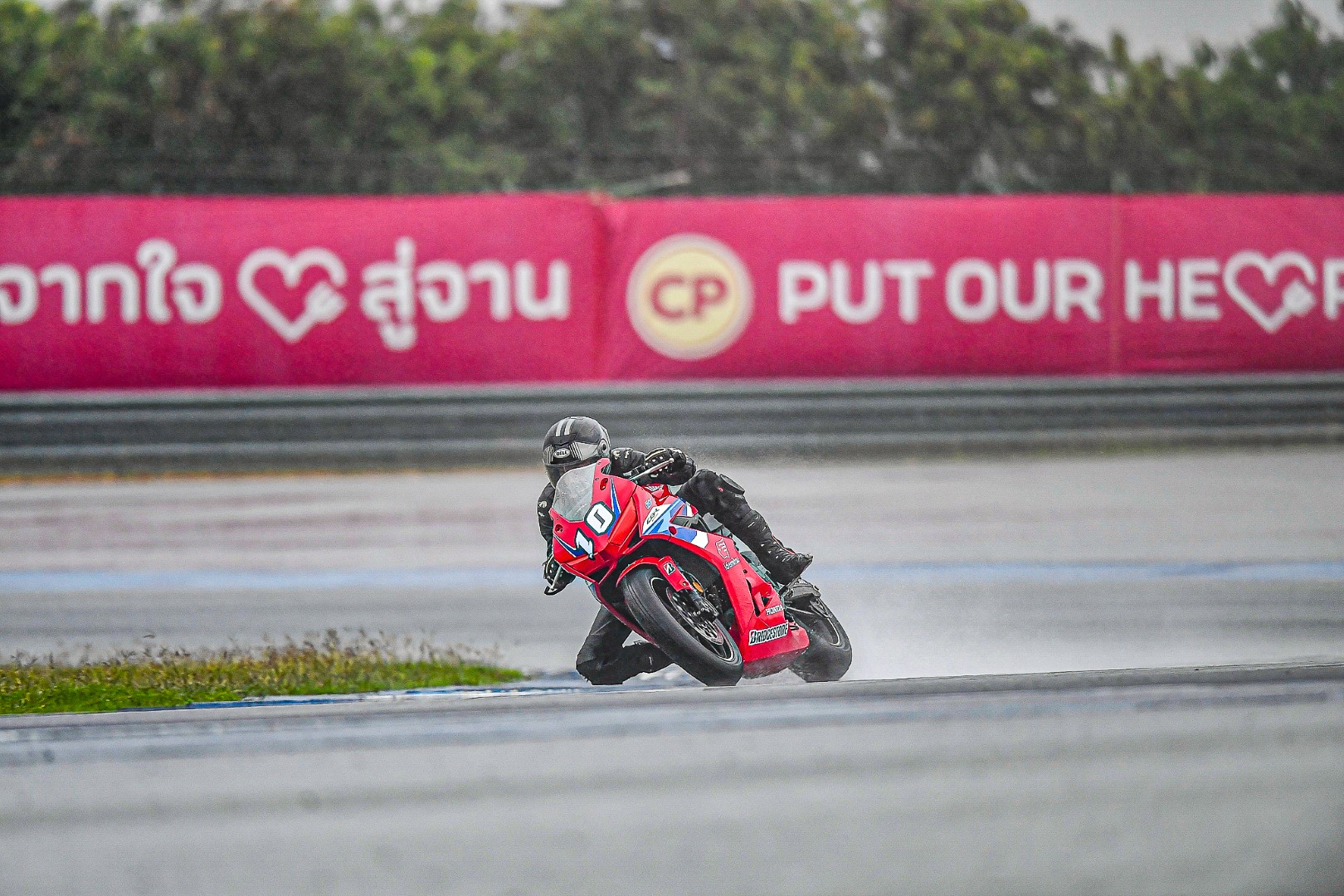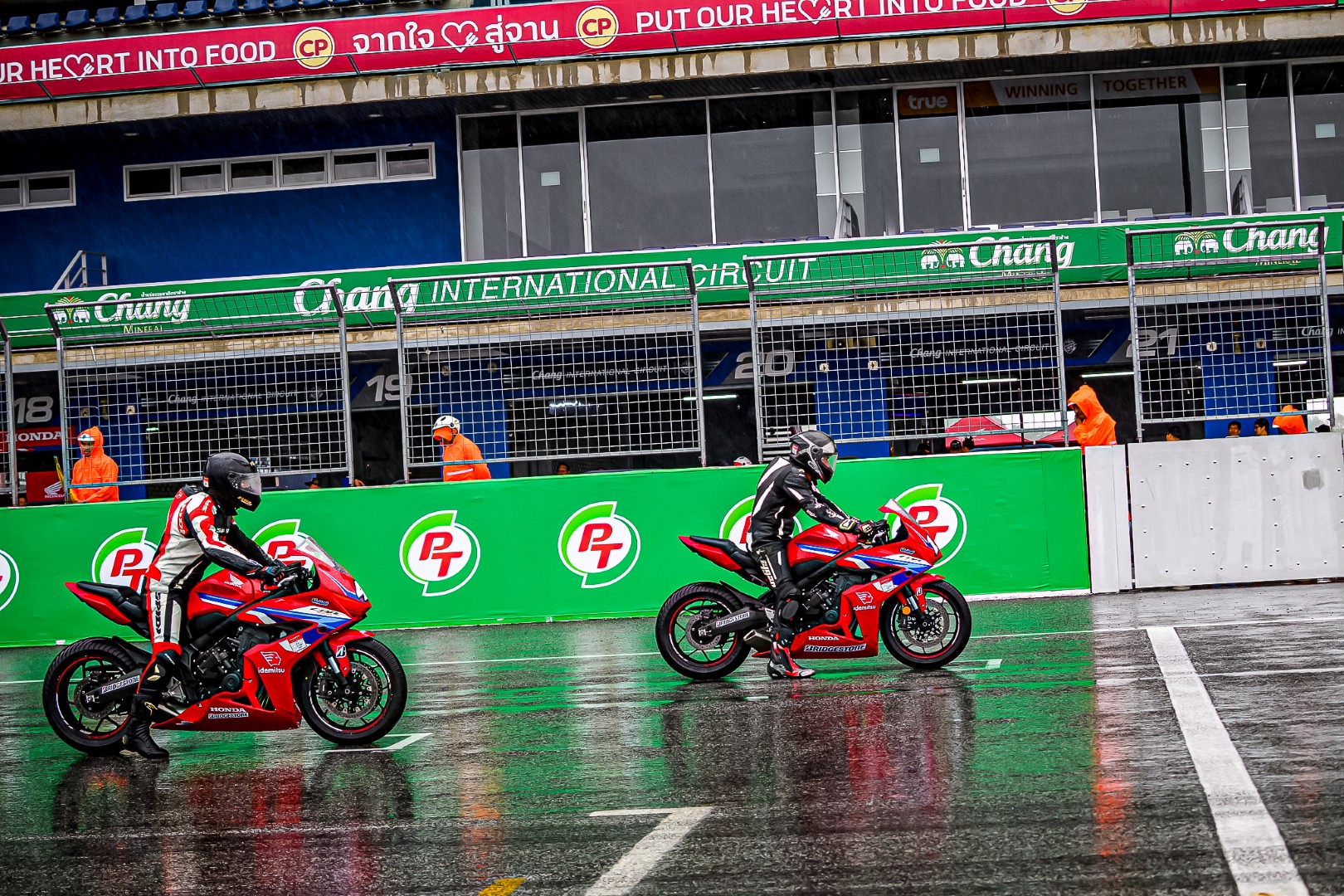 ถ้าใครไป Honda Track Day/Xperience ในวันนั้นจะรู้เลยว่า กว่าจะถึงการแข่งรุ่นสุดท้าย ก็ได้เปียกกันแบบชุ่มฉ่ำทั่วถึงแล้ว เพราะทั้งลมทั้งฝนมาจากไหนไม่รู้แบบจัดเต็มโดยไม่ให้สัญญาณ จนทางเจ้าหน้าที่ต้องหันมาถามว่าไหวกันไหม? แต่สื่อทุกคนกลับตอบเป็นเสียงเดียวกันว่า “ลุย” พอได้ยินแบบนั้น คุณนคร วิมลจิตสอาด ผู้จัดการทั่วไปสายงานสื่อสารการตลาด บริษัท ไทยฮอนด้า จำกัด ก็ไม่รอช้าสั่งเปลี่ยนยางฝน 12 ชุด ครบทั้ง 12 คัน ต้องบอกว่า “ใจมาก ๆ” ผมเองที่ติดใจในความหนึบของ BRIDGESTONE เลยขอเลือกเป็นรุ่น Racing Battlax W01
