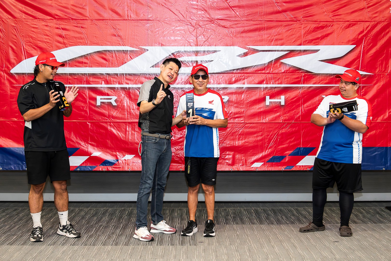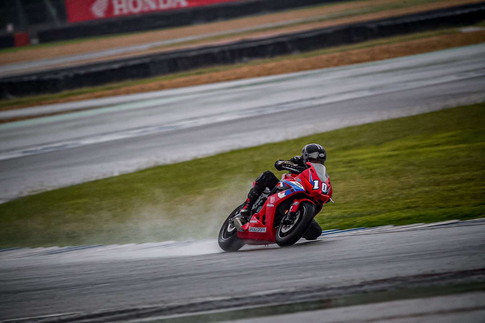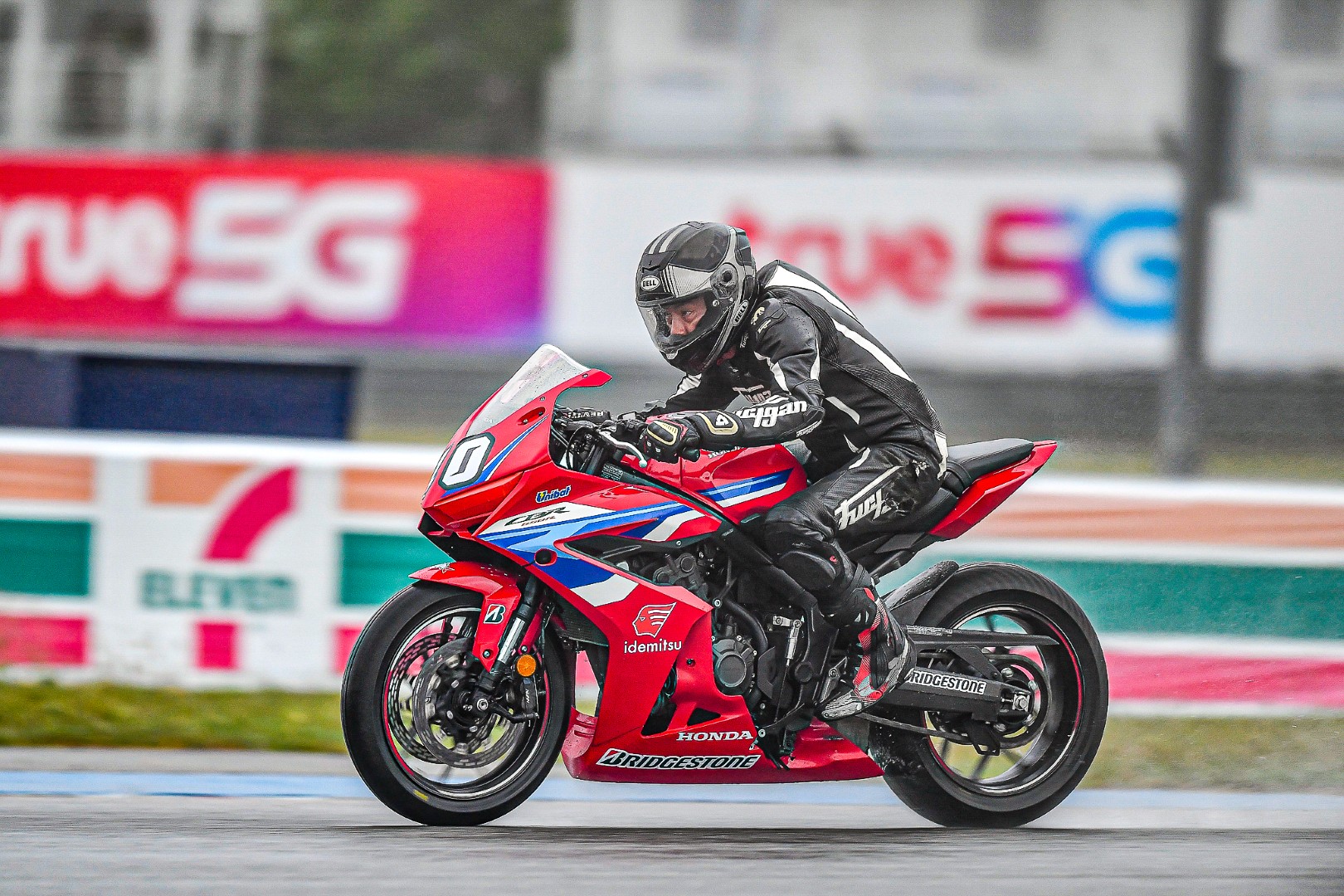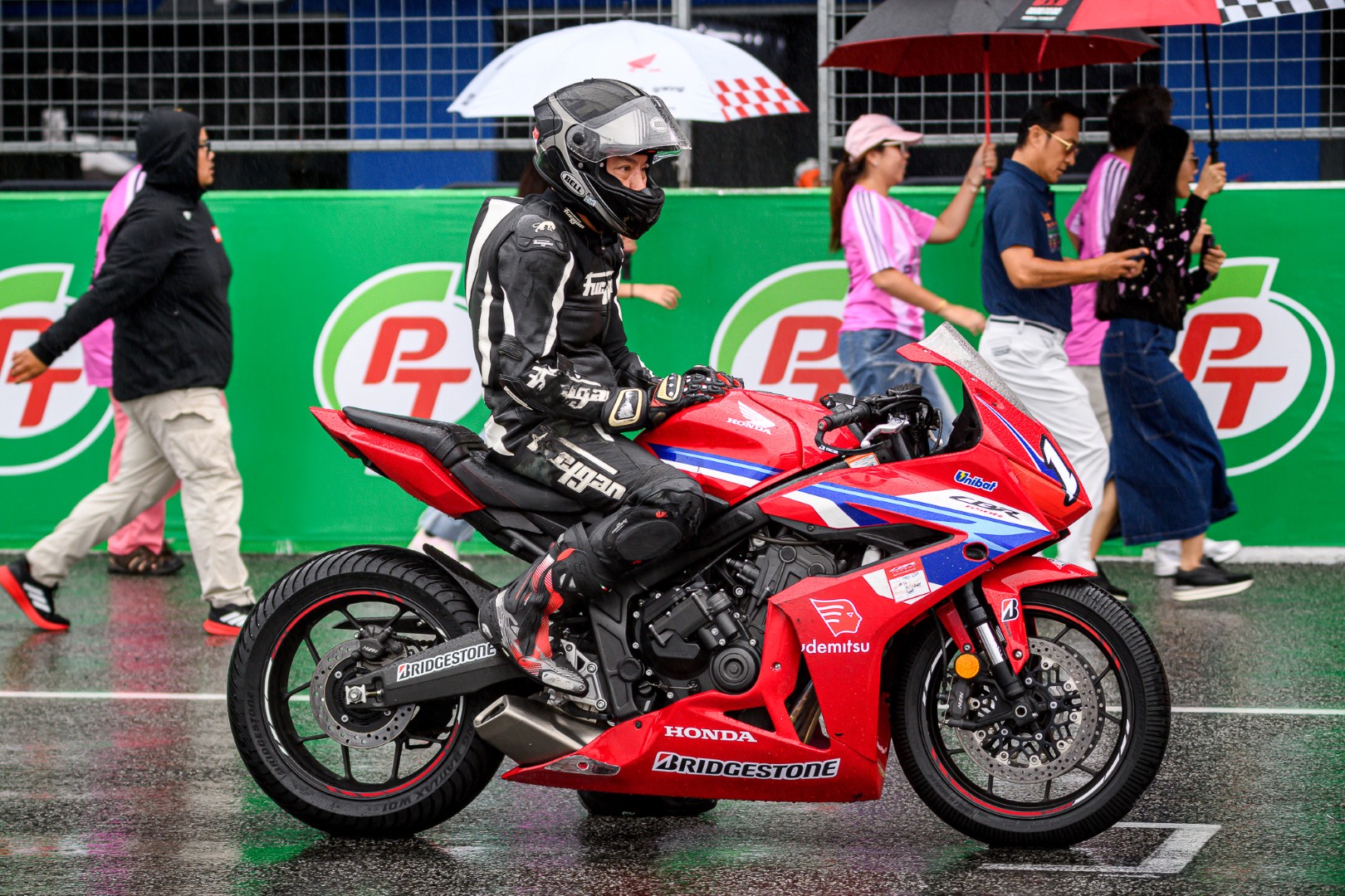 ถ้าใครไป Honda Track Day/Xperience ในวันนั้นจะรู้เลยว่า กว่าจะถึงการแข่งรุ่นสุดท้าย ก็ได้เปียกกันแบบชุ่มฉ่ำทั่วถึงแล้ว เพราะทั้งลมทั้งฝนมาจากไหนไม่รู้แบบจัดเต็มโดยไม่ให้สัญญาณ จนทางเจ้าหน้าที่ต้องหันมาถามว่าไหวกันไหม? แต่สื่อทุกคนกลับตอบเป็นเสียงเดียวกันว่า “ลุย” พอได้ยินแบบนั้น คุณนคร วิมลจิตสอาด ผู้จัดการทั่วไปสายงานสื่อสารการตลาด บริษัท ไทยฮอนด้า จำกัด ก็ไม่รอช้าสั่งเปลี่ยนยางฝน 12 ชุด ครบทั้ง 12 คัน ต้องบอกว่า “ใจมาก ๆ” ผมเองที่ติดใจในความหนึบของ BRIDGESTONE เลยขอเลือกเป็นรุ่น Racing Battlax W01