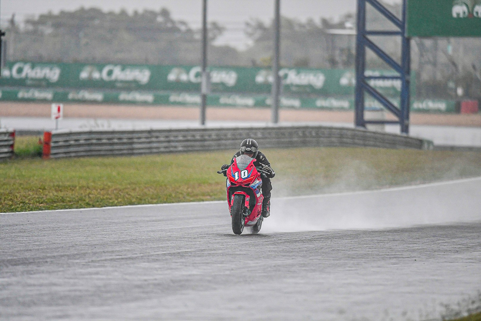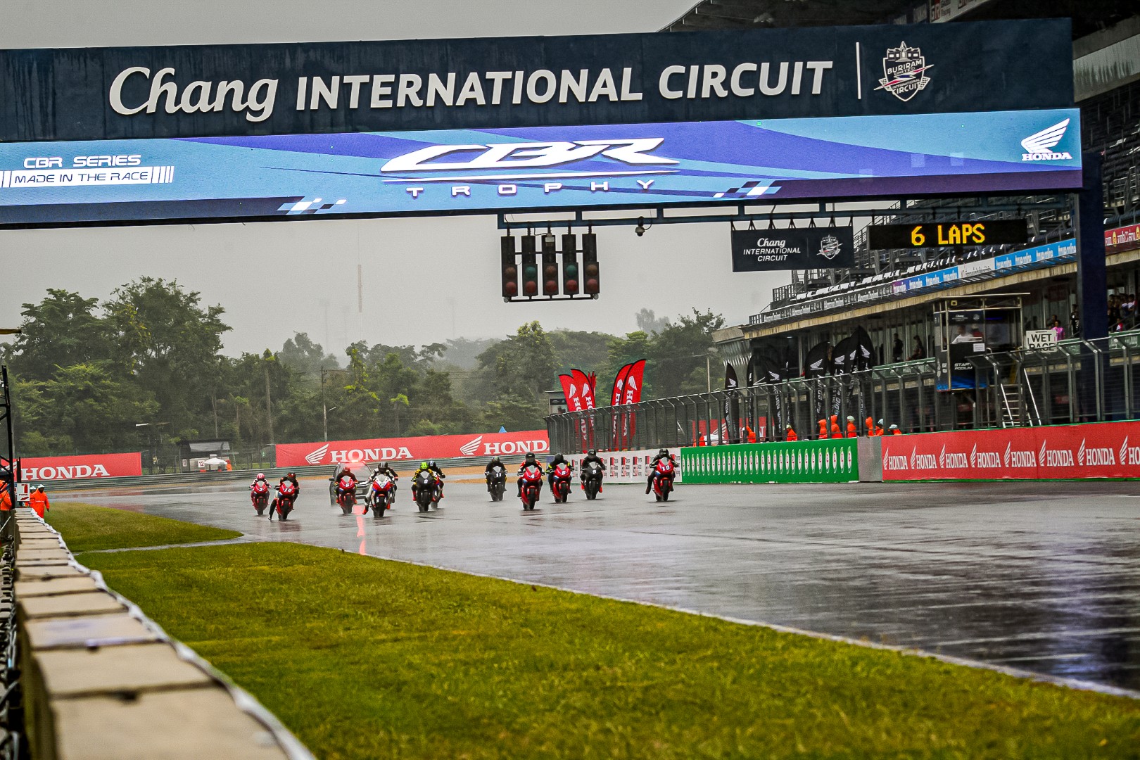 การแข่งถูกลดรอบลงจาก 8 รอบเหลือ 6 รอบ เพราะฝนที่โปรยลงมาแบบไม่มีทีท่าว่าจะหยุด ยางฝนทำงานได้เต็มประสิทธิภาพแน่นอน เพราะแทร็คชุ่มฉ่ำเสมอกันในทุกช่วง พอไฟแดงดับ เนื่องจากจุดนี้เป็นการชิงความได้เปรียบ ผมเลยขออาศัยประสบการณ์ยังไม่พึ่ง E-Clutch แต่เลือกที่จะรีดคลัตช์ออกตัวเองด้วยก้านคลัตช์ที่ตั้งไว้ต่ำมากแบบบีบทีติดปลอกแฮนด์ ซึ่ง…มันมีข้อดีคือ กำลังเครื่องยนต์ไม่ตก ความร้อนสะสมน้อยมากจากการเสียดสี แต่ต้องอาศัยความแม่นยำสูง เพราะผ่านช่วงนี้เราก็ไม่ต้องไปยุ่งกับก้านคลัตช์แล้ว