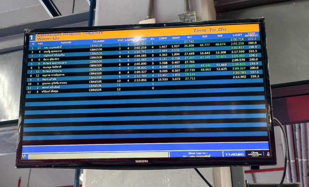 กลับเข้ามาพักปรับแรงดันลมยางอีกซักนิด ลงไปกดต่อในการซ้อมเซสชั่นสุดท้าย สามารถกดเวลาลงมาได้ที่ 2.00.323 พร้อมความเร็วเฉลี่ยสูงสุดที่ 205 กม./ชม. ด้วยระยะอัตราทดสเตอร์เดิมติดรถที่ยาวปรี๊ด แค่นี้ก็พอใจแล้วครับ