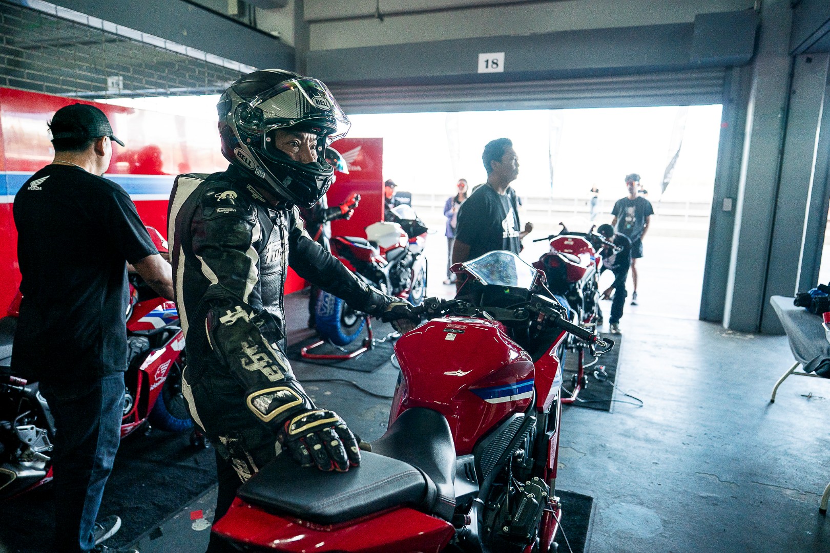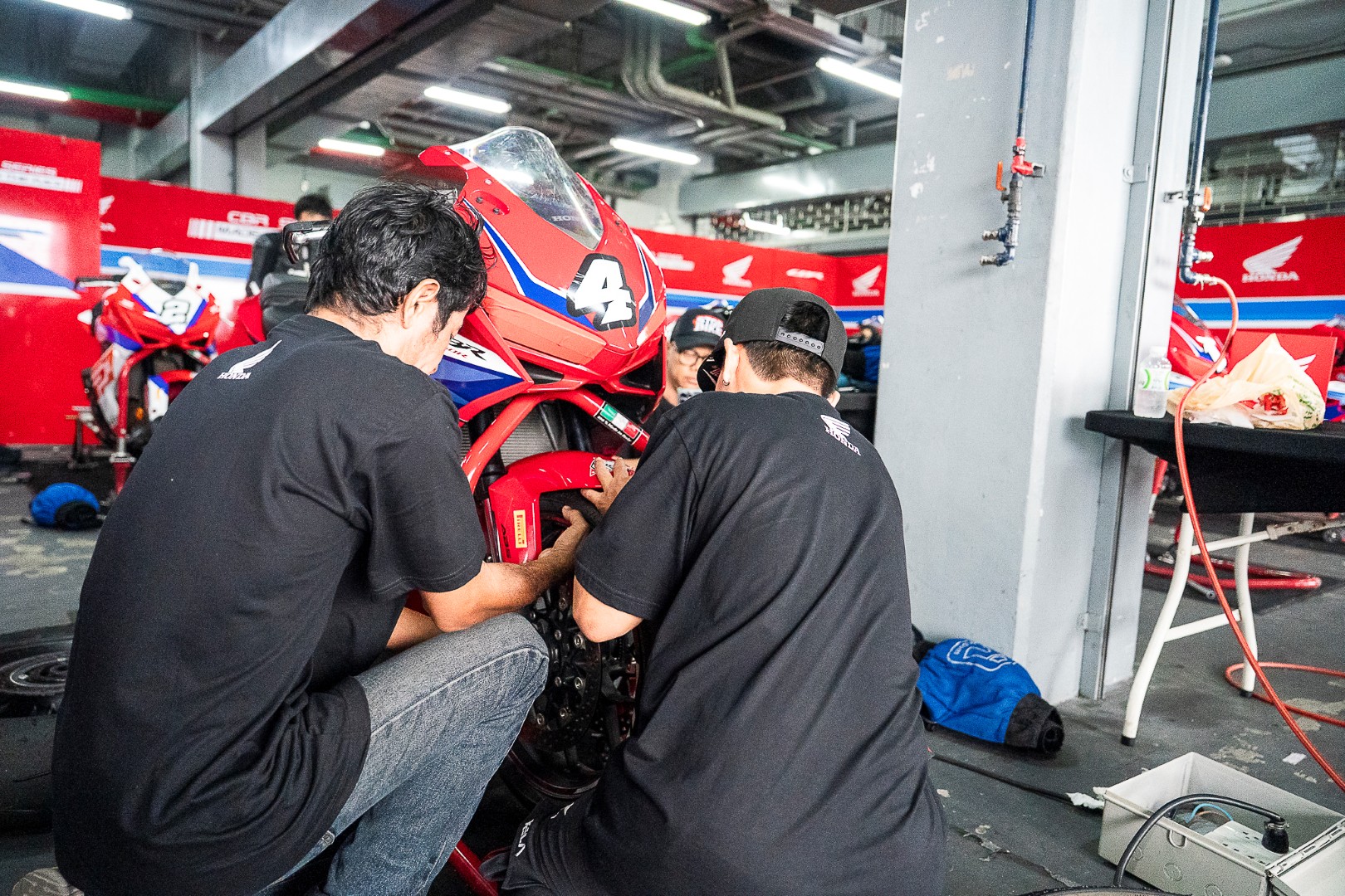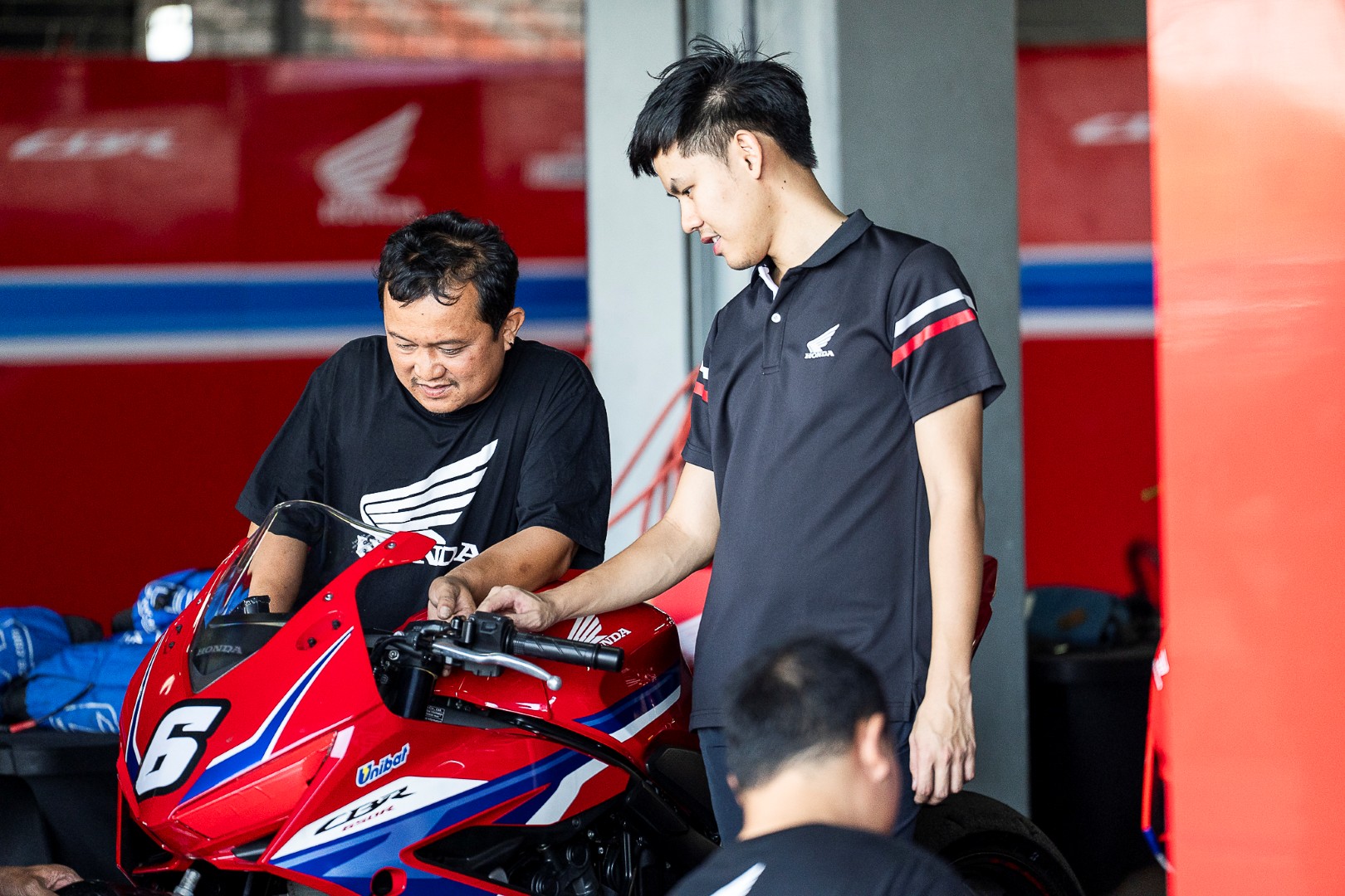 แข่งทางเรียบมาเกินครึ่งชีวิต เคยทำทีมแข่งมาก็หลายปี อย่างหนึ่งที่พูดได้เต็มปากว่าสำคัญไม่แพ้ฝีมือของนักแข่ง คือประสบการณ์และความเป็นมืออาชีพของทีมงาน ซึ่งเป็นสิ่งที่เหล่าทีมช่างของ Thai Honda มีอยู่อย่างเต็มเปี่ยม เปลี่ยนยางเสร็จปุ๊บ เขาลด Preload โช้คหลังให้นุ่มขึ้น พร้อมปรับลมให้เหมาะสมกับชนิดของยาง และสภาพของแทร็ค แบบพร้อมลงแข่งในทันที