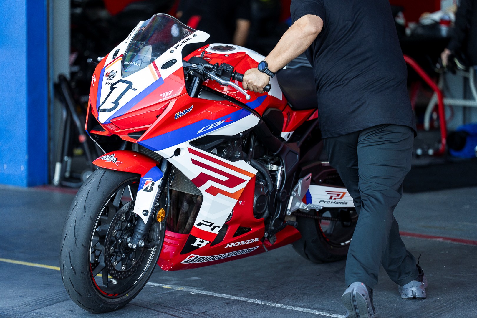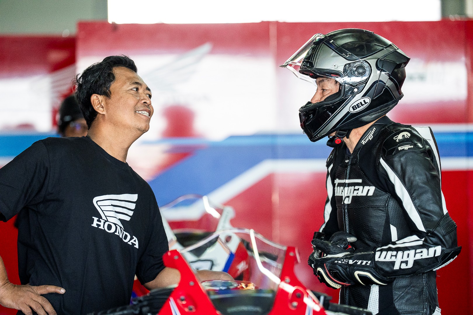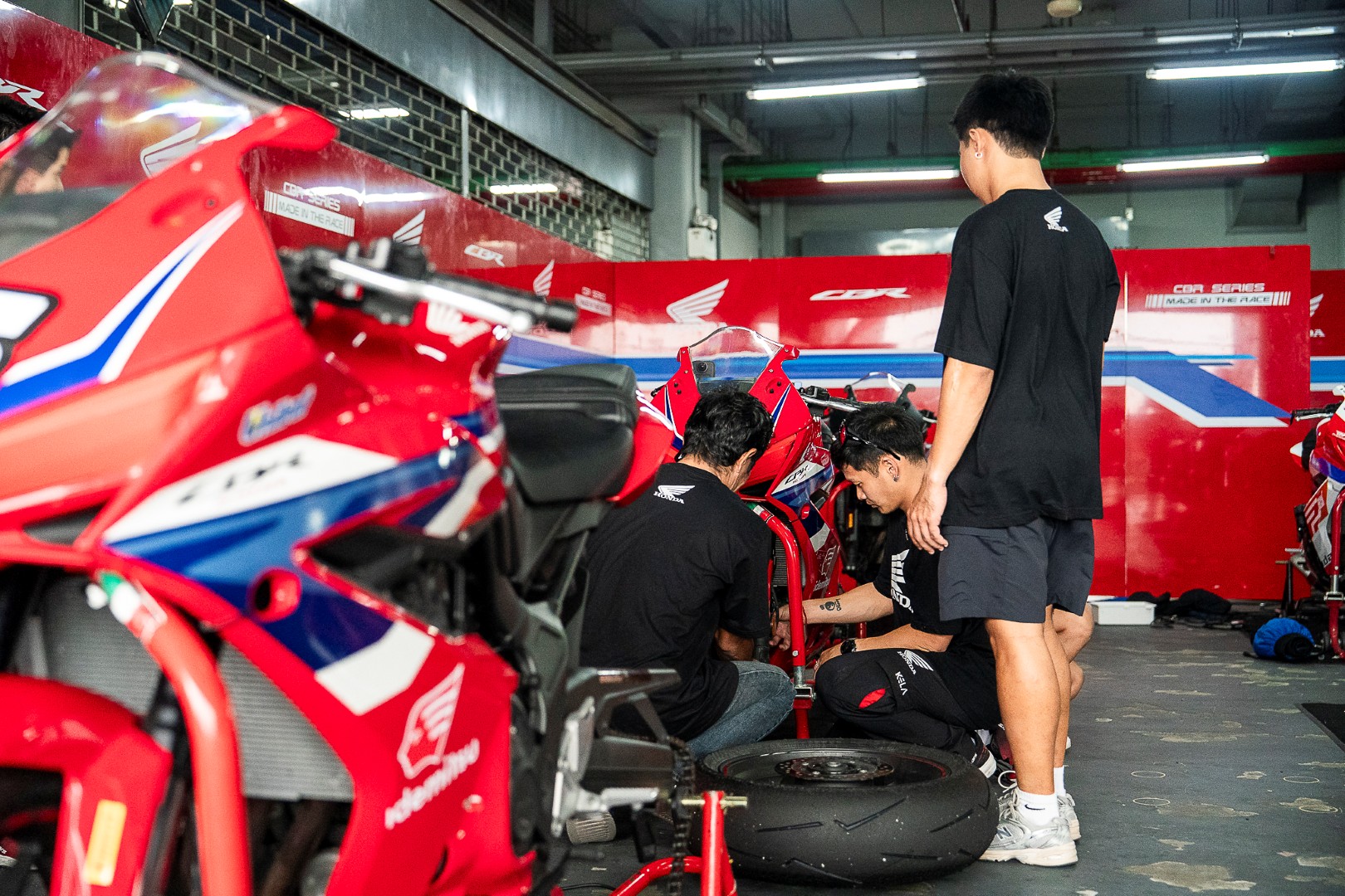 แข่งทางเรียบมาเกินครึ่งชีวิต เคยทำทีมแข่งมาก็หลายปี อย่างหนึ่งที่พูดได้เต็มปากว่าสำคัญไม่แพ้ฝีมือของนักแข่ง คือประสบการณ์และความเป็นมืออาชีพของทีมงาน ซึ่งเป็นสิ่งที่เหล่าทีมช่างของ Thai Honda มีอยู่อย่างเต็มเปี่ยม เปลี่ยนยางเสร็จปุ๊บ เขาลด Preload โช้คหลังให้นุ่มขึ้น พร้อมปรับลมให้เหมาะสมกับชนิดของยาง และสภาพของแทร็ค แบบพร้อมลงแข่งในทันที
