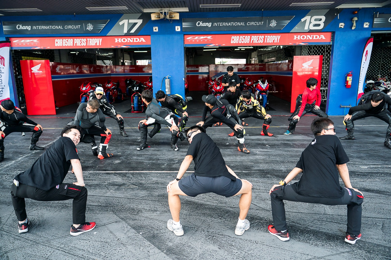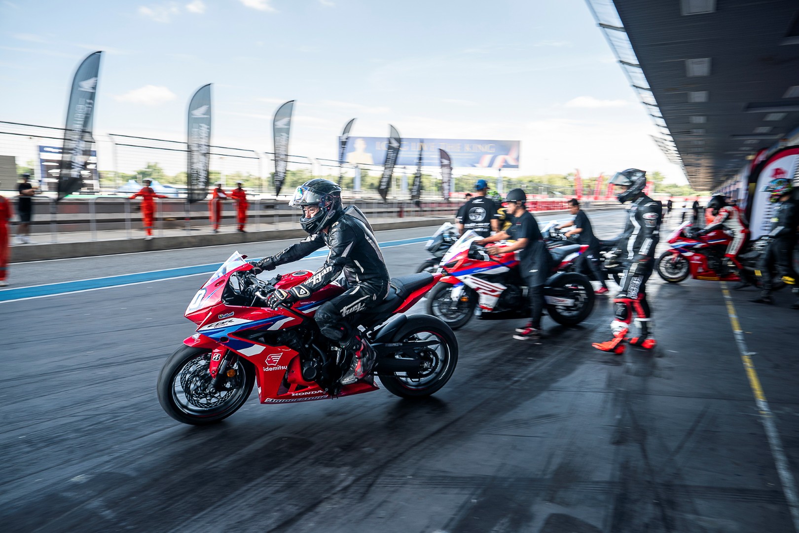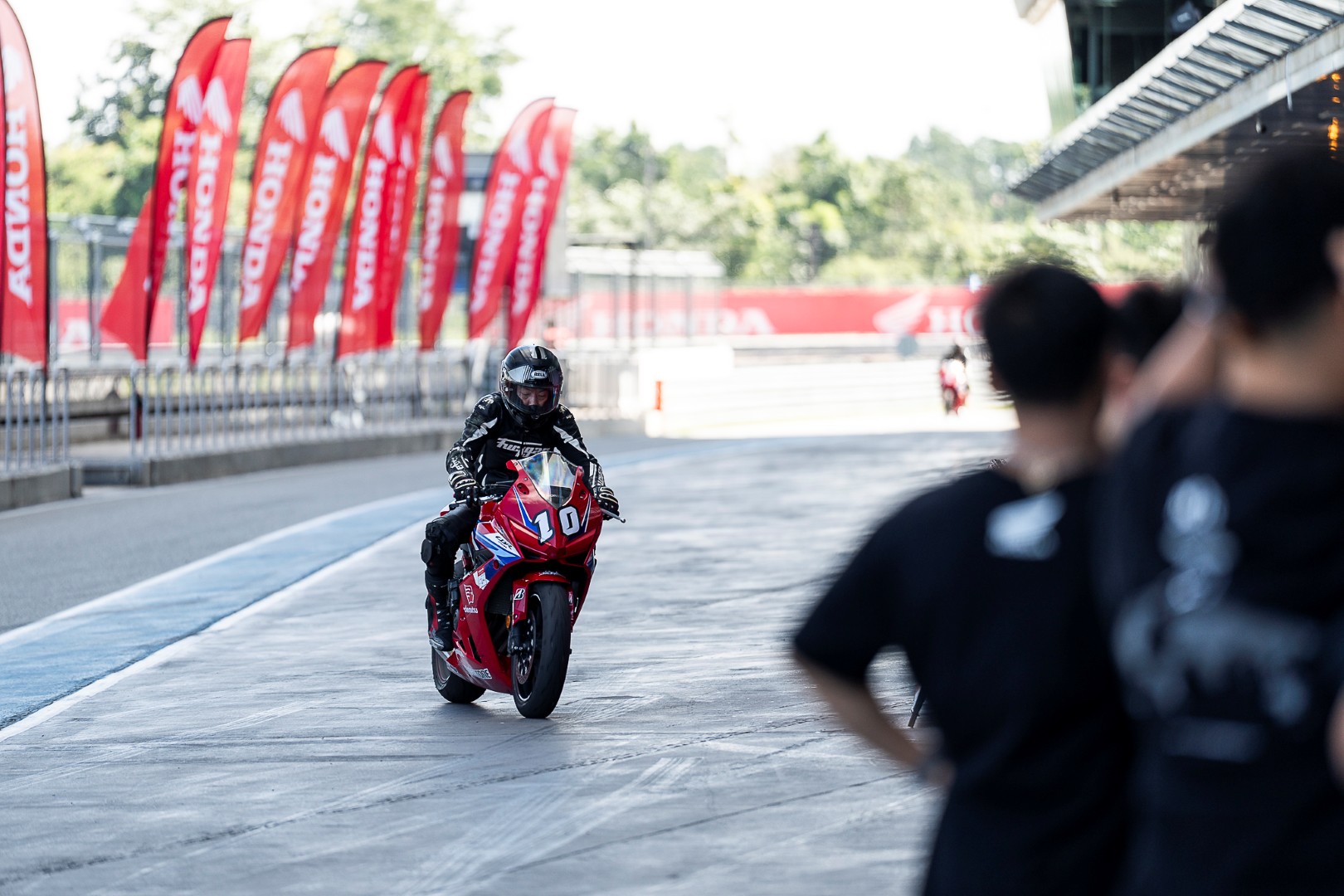 CBR650R E-Clutch แบบสต็อกเดิม ๆ ของเราถูกเตรียมไว้พร้อมสมบูรณ์โดยทีมช่างมากประสบการณ์จากไทยฮอนด้า บรรยากาศในพิทที่ปกติเป็นกันเองแบบ Trackday เริ่มเปลี่ยนเป็นโหมดจริงจังทันที ทุกคนต่างอยากแสดงฝีมือ และต้องการคว้าชัยชนะ ซึ่งถือเป็นบรรยากาศที่ผมคุ้นเคยดีสมัยยังแข่งขันอยู่