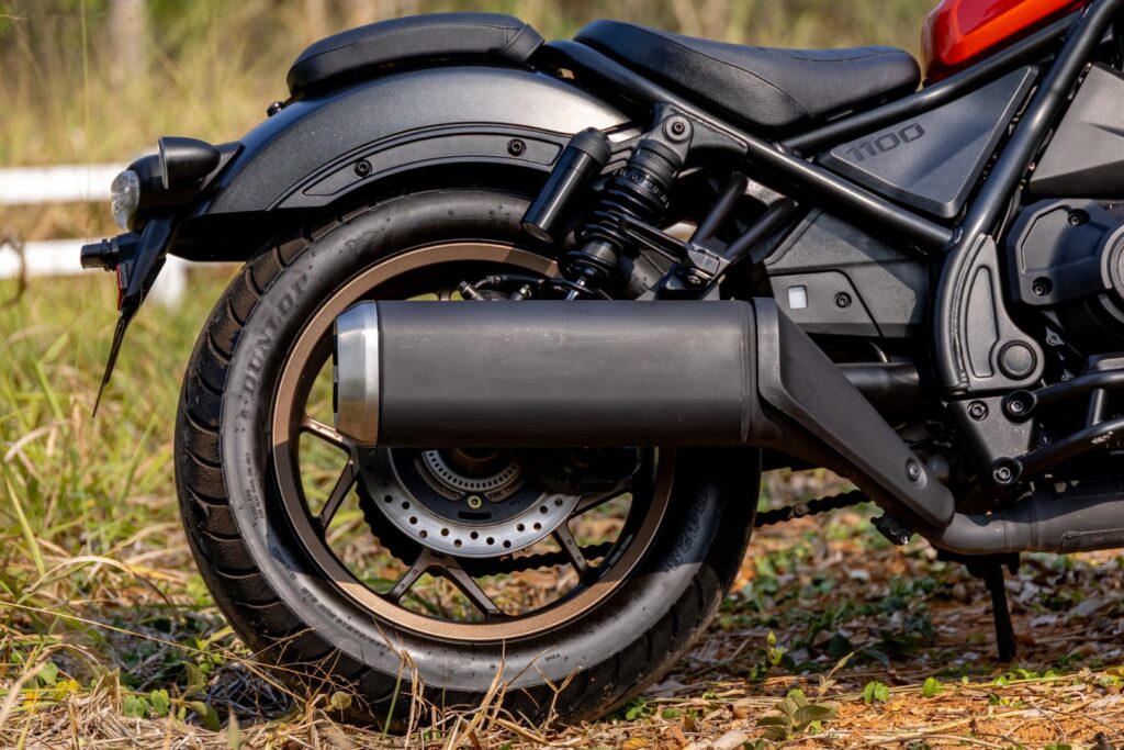 ส่วนด้านหลังใช้กันสะเทือนคู่ของ Showa ที่สามารถปรับตั้งค่าพรีโหลดสปริงได้ มีระยะยุบตัวประมาณ 3.7 นิ้ว ทำงานร่วมกับล้อหลังขอบ 16 นิ้ว ที่ใส่ยางไซส์ 180/65 ส่งผลให้การเลี้ยวทำได้อย่างเป็นธรรมชาติ ไม่ขืนจนต้องดึงแฮนด์เข้าหาตัวช่วยอีกแรง