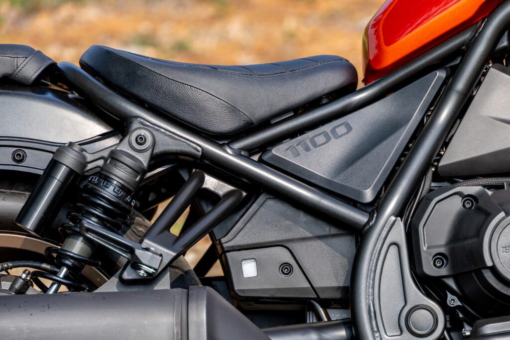 ด้วยความที่ถูกวางมาให้เป็นรถในสไตล์ Bobber ที่เน้นความเปลือย และคล่องตัวเหมือนกัน จึงจำเป็นต้องมีความแตกต่างในเรื่องงานดีไซน์ อย่างแรกที่เห็นเลยสำหรับ Rebel 1100 DCT คือ ด้านหน้าที่ยกสูงรับกับถังน้ำมันทรงหยดน้ำความจุ 13.6 ลิตร ซึ่งออกแบบให้ไล่สโลปลงหาตัวผู้ขี่ ทำให้สัดส่วนของตัวรถดูลงตัวมีมิติ เครื่องยนต์สองสูบ Parallel-Twin ถูกห้อยไว้บนเฟรม Dimond steel เอียงไปด้านหน้า 80° ตัวเฟรมมีความเข้ารูปทำให้รถดูแคบเพรียว โดยวางองศาคอ (Rake) ไว้ 28° เพื่อให้หน้าไม่หนักเวลาทำมุมเลี้ยว ซึ่งเป็นองศาที่ให้เสถียรภาพที่สุด พร้อมวางบาลานซ์น้ำหนักของจุดศูนย์ถ่วงโน้มไปด้านหน้า เพื่อการควบคุมทิศทางที่แม่นยำ