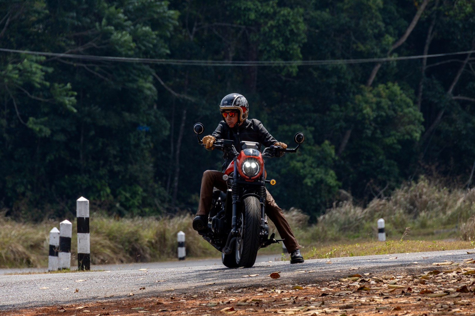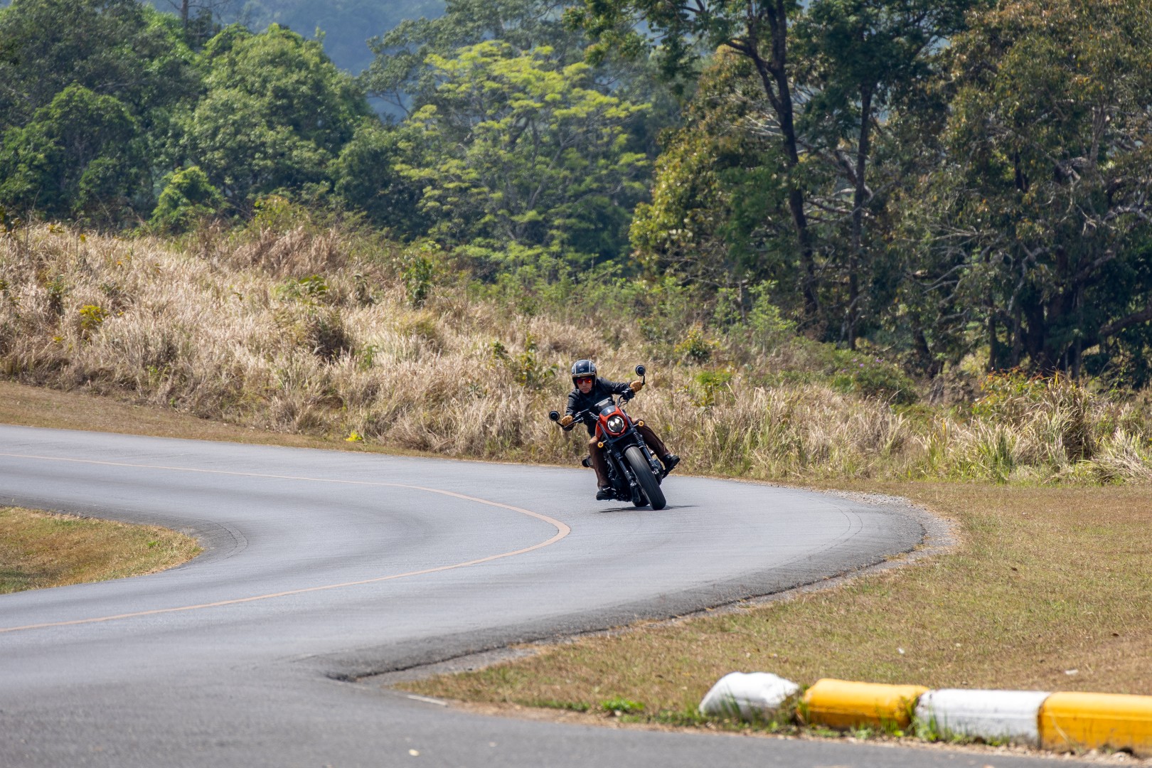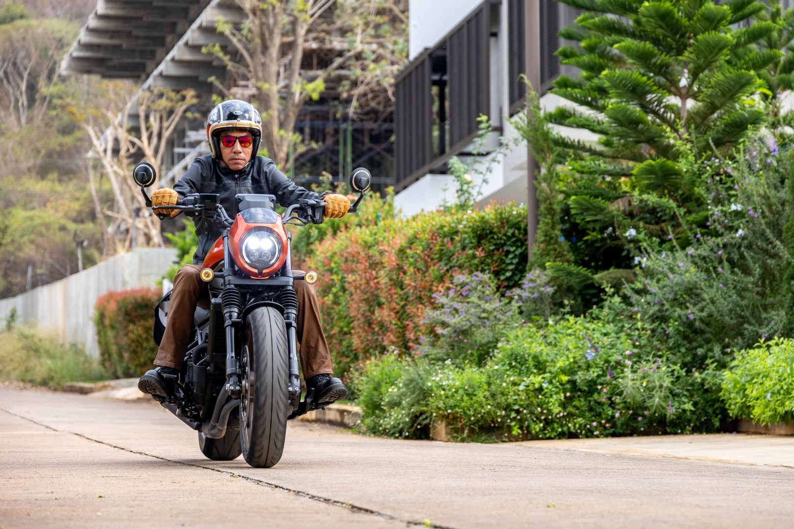 ด้วยความที่ตัวรถมาในสไตล์ Low Ride น้ำหนักค่อนข้างมาก แฮนด์ต่ำและกว้าง ถังน้ำมันยาว พักเท้าวางกึ่งกลางแบบ Mid-mount และเบาะเตี้ย ตำแหน่งท่านั่งออกแบบมาให้ดันตัวไปติดด้านหลังพนักเบาะ เวลาหักแฮนด์จึงต้องเอนตัวกับไหล่ตามมุมเลี้ยวของแฮนด์ด้วย อย่าเพิ่ง “มือตึง” เลี้ยวในความเร็วต่ำแบบไม่เอาเท้าลง โดยเฉพาะจังหวะรถติด หรือมุดไหลไปตามการจราจร หากต้องเอาเท้าลงแตะพื้นข้างหนึ่งเพื่อรักษาบาลานซ์ ถ้ายังไม่ชินกับอัตราเร่งรอบต่ำของรถที่บิดแล้ว “ตื๊ด” ทันที เท้าอีกข้างควรคุมไว้ที่คันเบรกหลังเสมอ