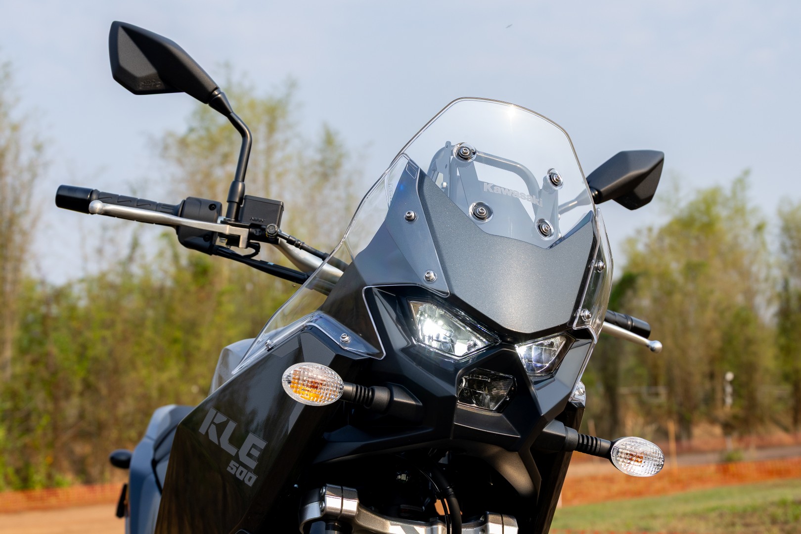 รถสไตล์แอดเวนเจอร์ที่ใช้ล้อหน้าขอบ 21 นิ้ว ส่วนมากจะออกแบบให้เคาริ่งหน้าใหญ่ครอบคลุมตัวผู้ขับขี่ จนบางครั้งขี่ทางไกลนาน ๆ ต้องยืนเพื่อคลายร้อน มันดูดุดัน หรูหราก็จริง แต่พอความเร็วขึ้นสูงมาก ๆ หน้ารถมักจะส่าย บางครั้งก็แกว่งจนน่าใจหาย แต่ KLE 500 ที่ใช้ล้อขอบเดียวกัน รัดมาด้วยยาง On/Off ขนาด 90/90 ลองซัดเต็มข้อ กลับไม่มีอาการหน้ากระพือหรือสะบัดให้เห็น ซึ่งถือเป็นข้อดีของรถขนาดกลางที่เคาริ่งหน้ามีขนาดเล็ก เพรียว และช่วยตัดอากาศได้ดีจนรถไม่ต้านลมมาก จะนั่งกดความเร็วบนทางดำ หรือยืนขี่แบบกระแทกคันเร่งบนทางฝุ่น ก็ไปได้แบบนิ่ง ๆ