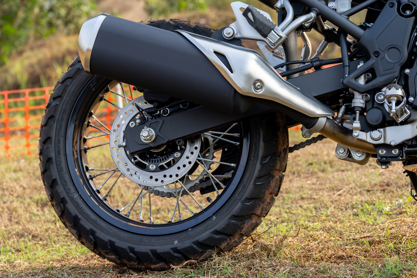ไล่ยาวไปจนถึงช่วงท้ายที่มีความเพรียว แต่เน้นความแข็งแรงของโครงสร้าง มีรูน็อตไว้รองรับการใส่ทั้งกล่องหลังหรือติดปิ๊บข้าง พักเท้าเป็นแบบหนาม มียางตรงกลางไว้สำหรับการใช้งานบนถนน แต่ถ้าอยากลุยจริงจังก็สามารถถอดยางออกได้ ล้อซี่ลวดขนาด หน้า 21” / หลัง 17” ช่วยซับแรงสะเทือน คุมง่าย รัดด้วยยาง On/Off Road (กึ่งวิบาก) วิ่งได้ทั้งทางเรียบและทางฝุ่น