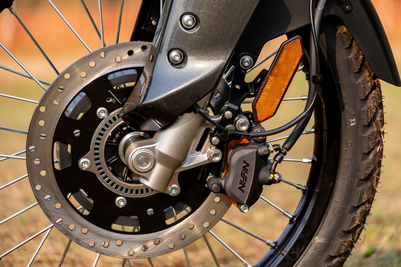 ระบบเบรกหน้าดิสก์เดี่ยว ขนาด 300 มม. พร้อมคาลิเปอร์ Nissin 2 ลูกสูบ เอาอยู่สบาย ๆ ถึงแม้เป็นทางฝุ่นก็สามารถบีบและไล่น้ำหนักเบรกได้รวดเร็วตามต้องการ โดยไม่ต้องกังวลว่าเบรกจะล็อก แรงดันคาลิเปอร์มีความแม่นยำสัมพันธ์กับน้ำหนักการกดที่ปลายนิ้ว