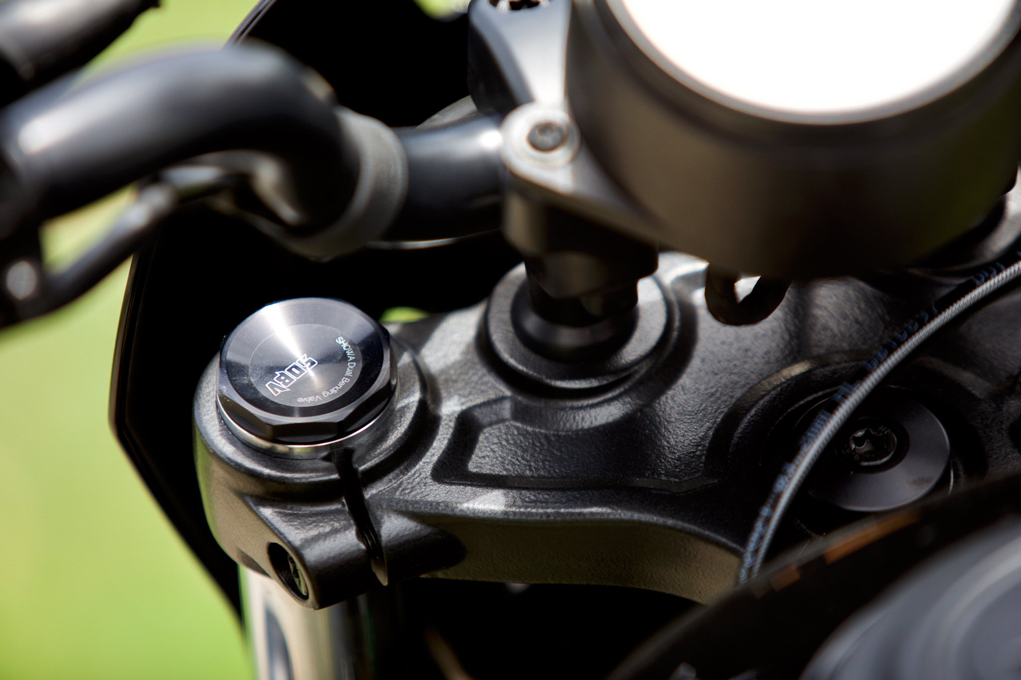 เฟรมชุดหลังใหม่ออกแบบมาง่าย ๆ ยังคงกลิ่นอายของความดั้งเดิม สวิงอาร์มเชื่อมต่อตรงกับโช้คคู่โดยไม่มีกระเดื่องทดแรง มีเกรียวปรับพรีโหลดสปริง ส่วนกันสะเทือนหน้าอันนี้เจ๋งมาก เพราะเป็น Telescopic SDBV (Showa Dual bending valve) ซึ่งเป็นโช้คระบบใหม่ของ Showa แกน 41 มม. ที่ไม่ใช้ชิมวาล์ว เพราะกำหนดให้น้ำมันโช้คเดินทางเดียวผ่านวันเวย์วาล์ว ไปวาล์วรีบาว และไหลผ่านวาล์วคอมเพลส โดยไม่สูญเสียความแม่นยำในการทำงานและซับแรงสะเทือน
