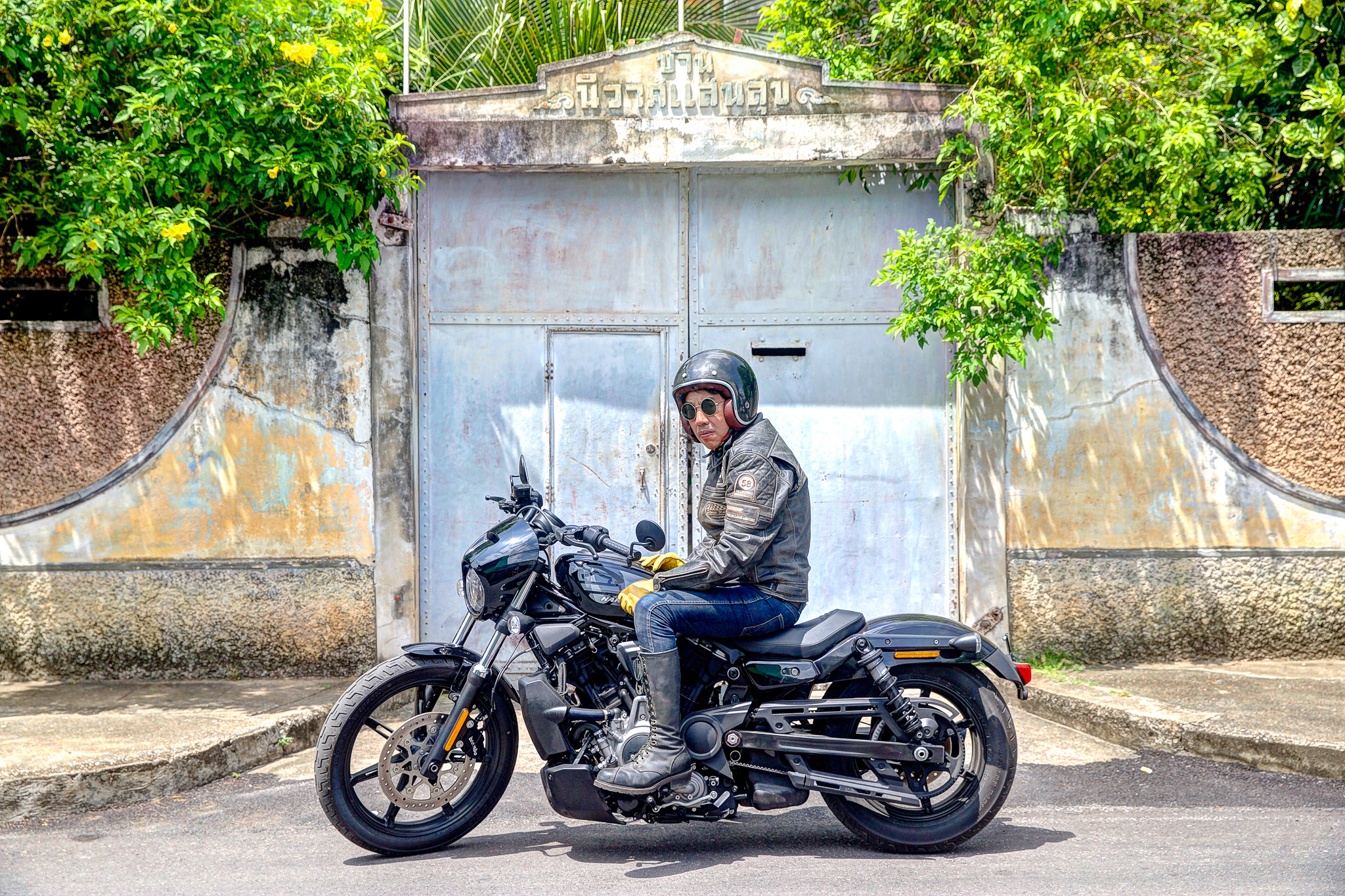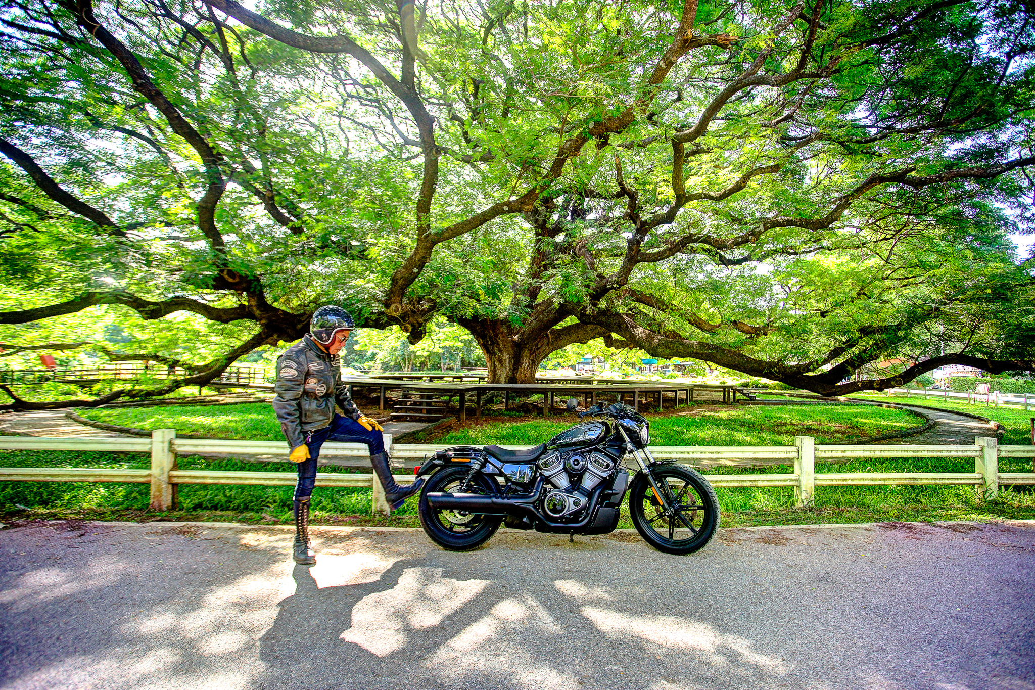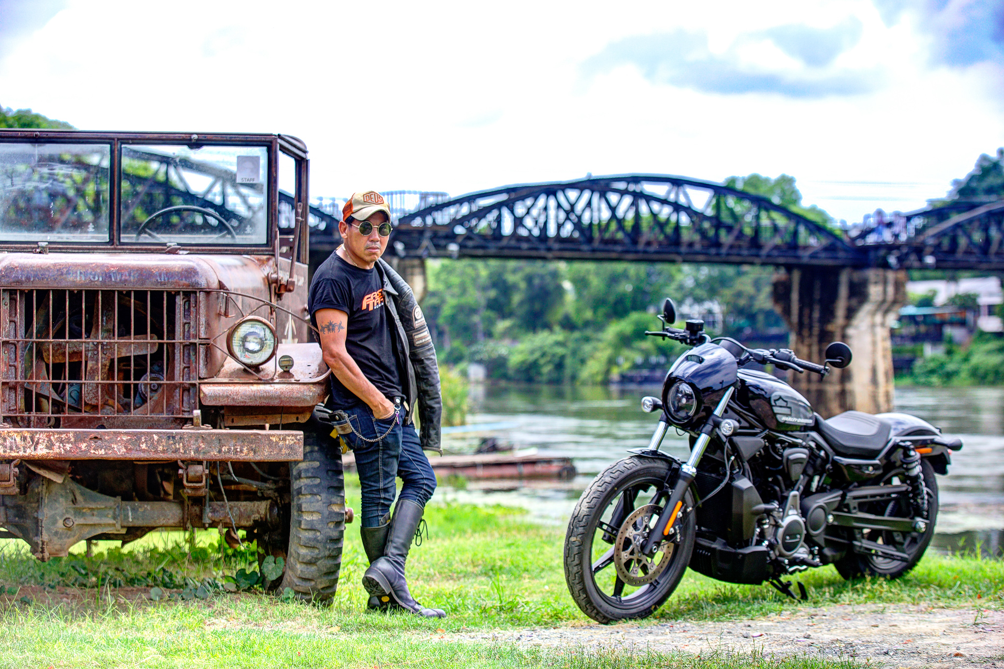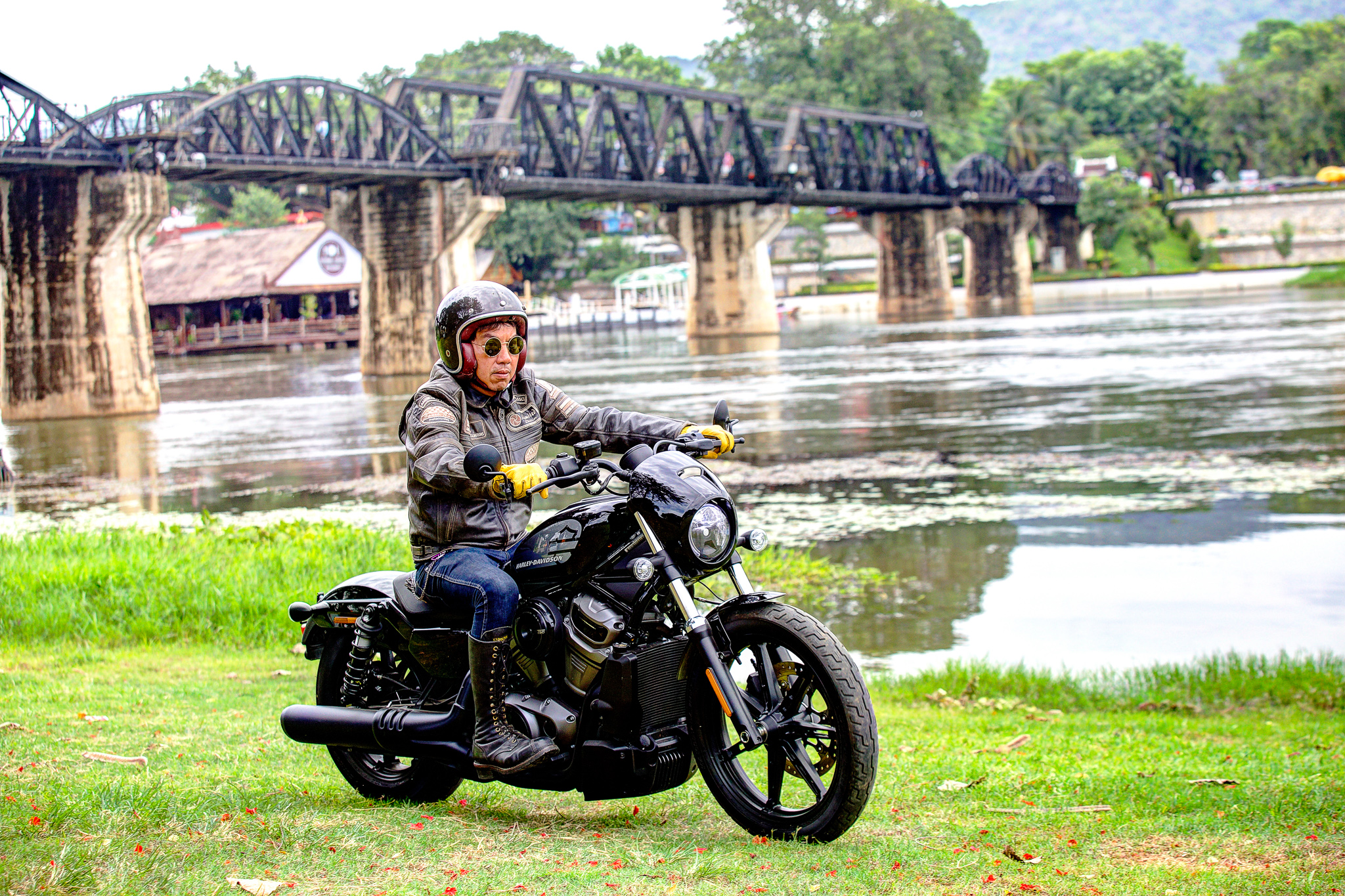 หลังออกจากโรงงานกระดาษมา และขี่ไปเก็บภาพสวย ๆ ตามทางเป็นที่เรียบร้อย จุดหมายสุดท้ายของเราคือ ตลาดเชลยศึก ริมแม่น้ำแคว ซึ่งผมคุ้นเคยเป็นอย่างดี ในลานกว้างร้างผู้คนที่มีเก้าอี้และโต๊ะวางไว้ของร้านเครื่องดื่มที่น่าจะเตรียมเปิดในช่วงเย็น เรานึกอยากลองความสามารถในการเลี้ยวมุมแคบ ๆ ของ Nightster™ ดูให้รู้ชัดว่ามันขี่ง่ายจริงไหม เบาขนาดนี้จะพลิ้วสักแค่ไหน