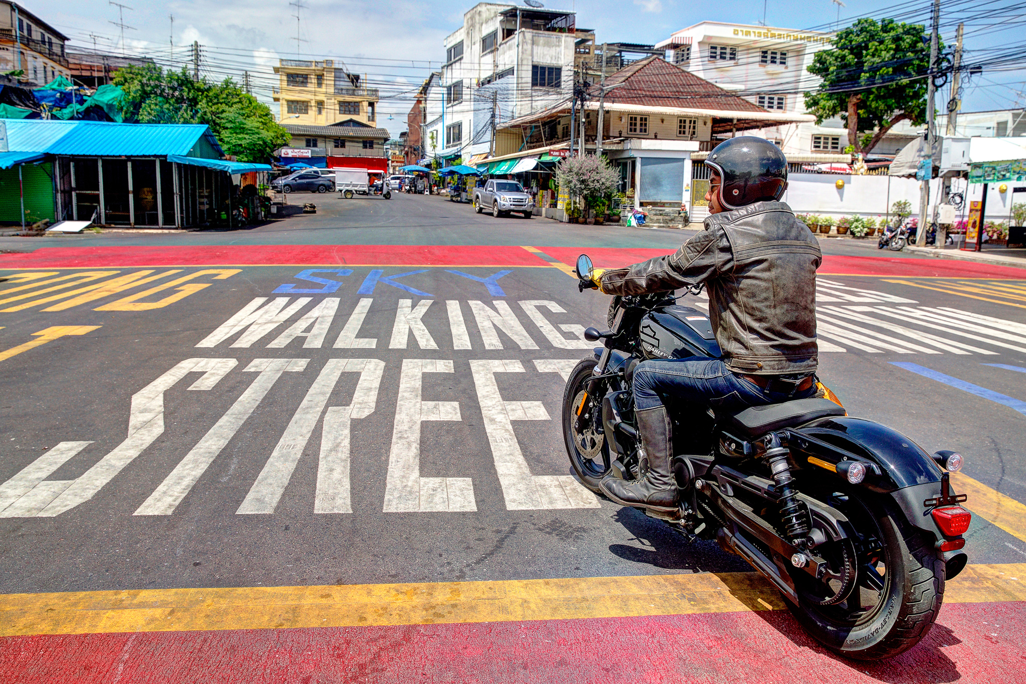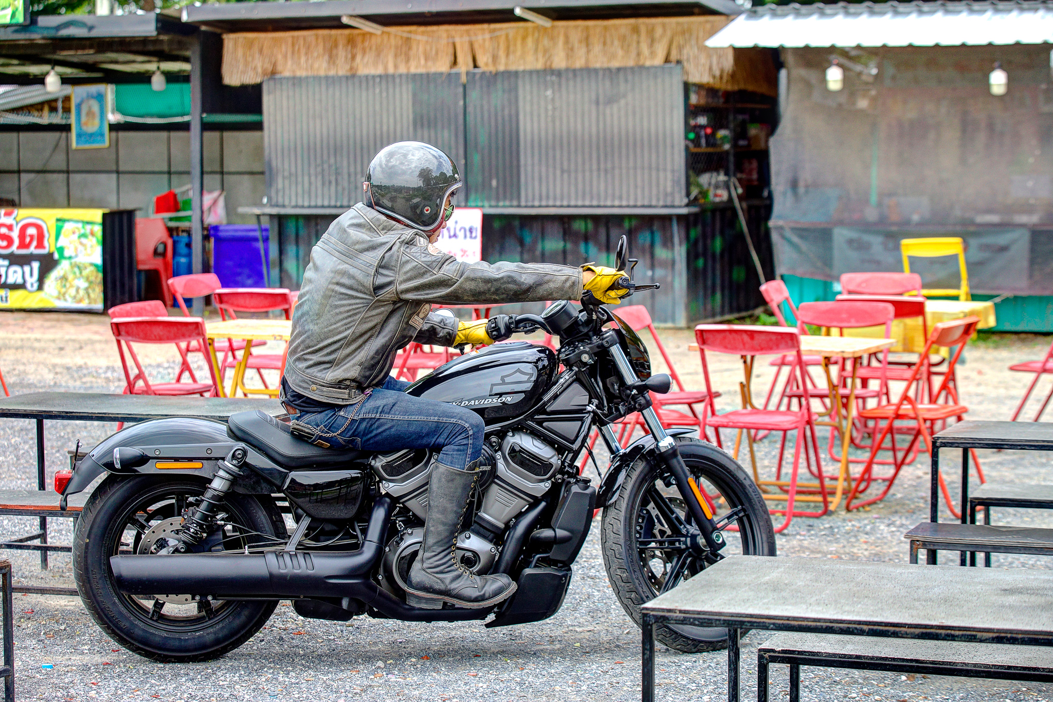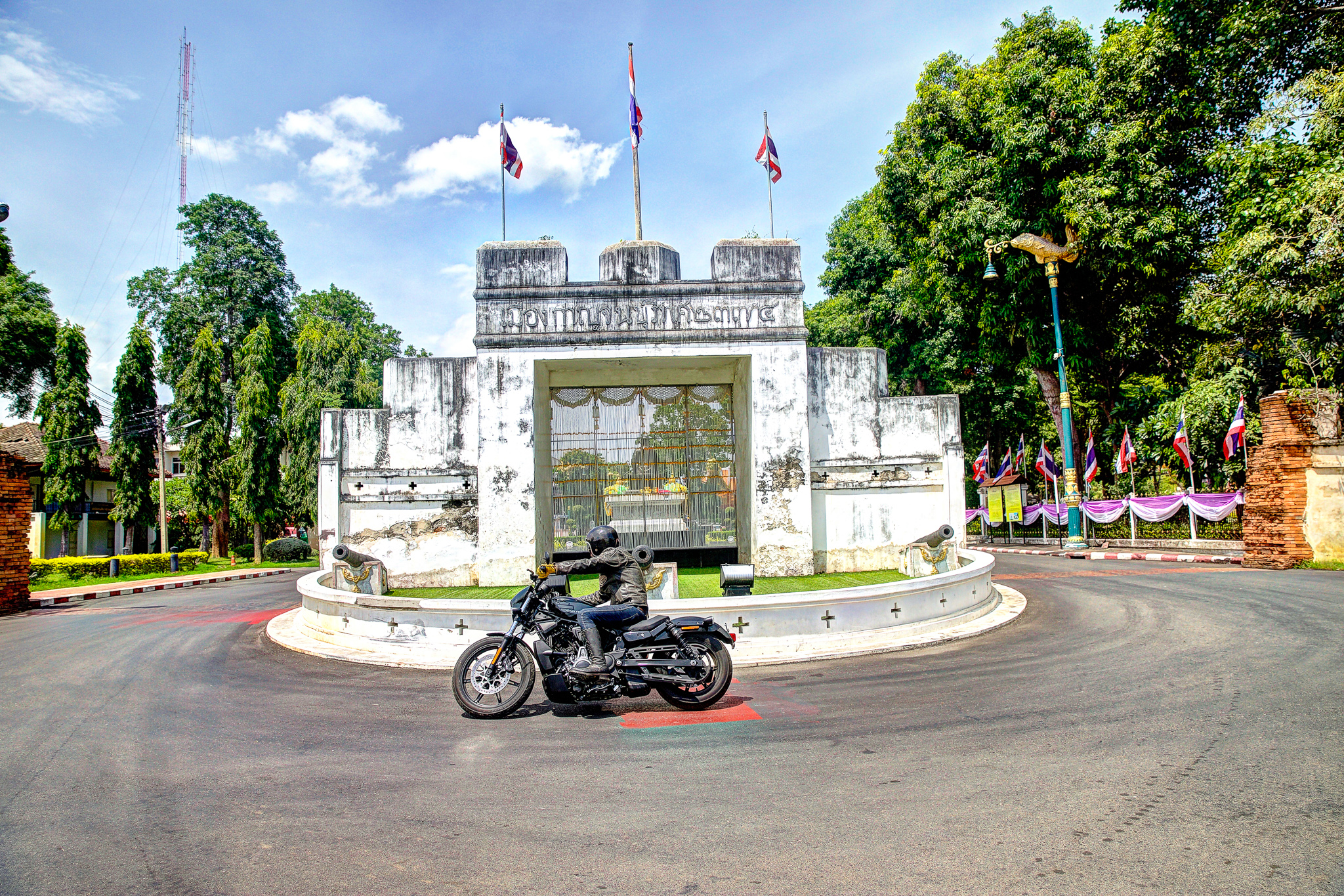 หลังออกจากโรงงานกระดาษมา และขี่ไปเก็บภาพสวย ๆ ตามทางเป็นที่เรียบร้อย จุดหมายสุดท้ายของเราคือ ตลาดเชลยศึก ริมแม่น้ำแคว ซึ่งผมคุ้นเคยเป็นอย่างดี ในลานกว้างร้างผู้คนที่มีเก้าอี้และโต๊ะวางไว้ของร้านเครื่องดื่มที่น่าจะเตรียมเปิดในช่วงเย็น เรานึกอยากลองความสามารถในการเลี้ยวมุมแคบ ๆ ของ Nightster™ ดูให้รู้ชัดว่ามันขี่ง่ายจริงไหม เบาขนาดนี้จะพลิ้วสักแค่ไหน